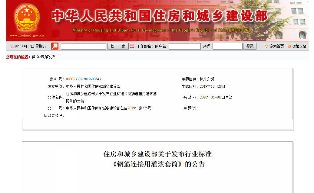 現(xiàn)批準(zhǔn)《鋼筋連接用灌漿套筒》為建筑工業(yè)行業(yè)產(chǎn)品標(biāo)準(zhǔn),編號(hào)為JG/T398-2019,自2020年6月1日起實(shí)施。原《鋼筋連接用灌漿套筒》(JG/T398-2012)同時(shí)廢止。
